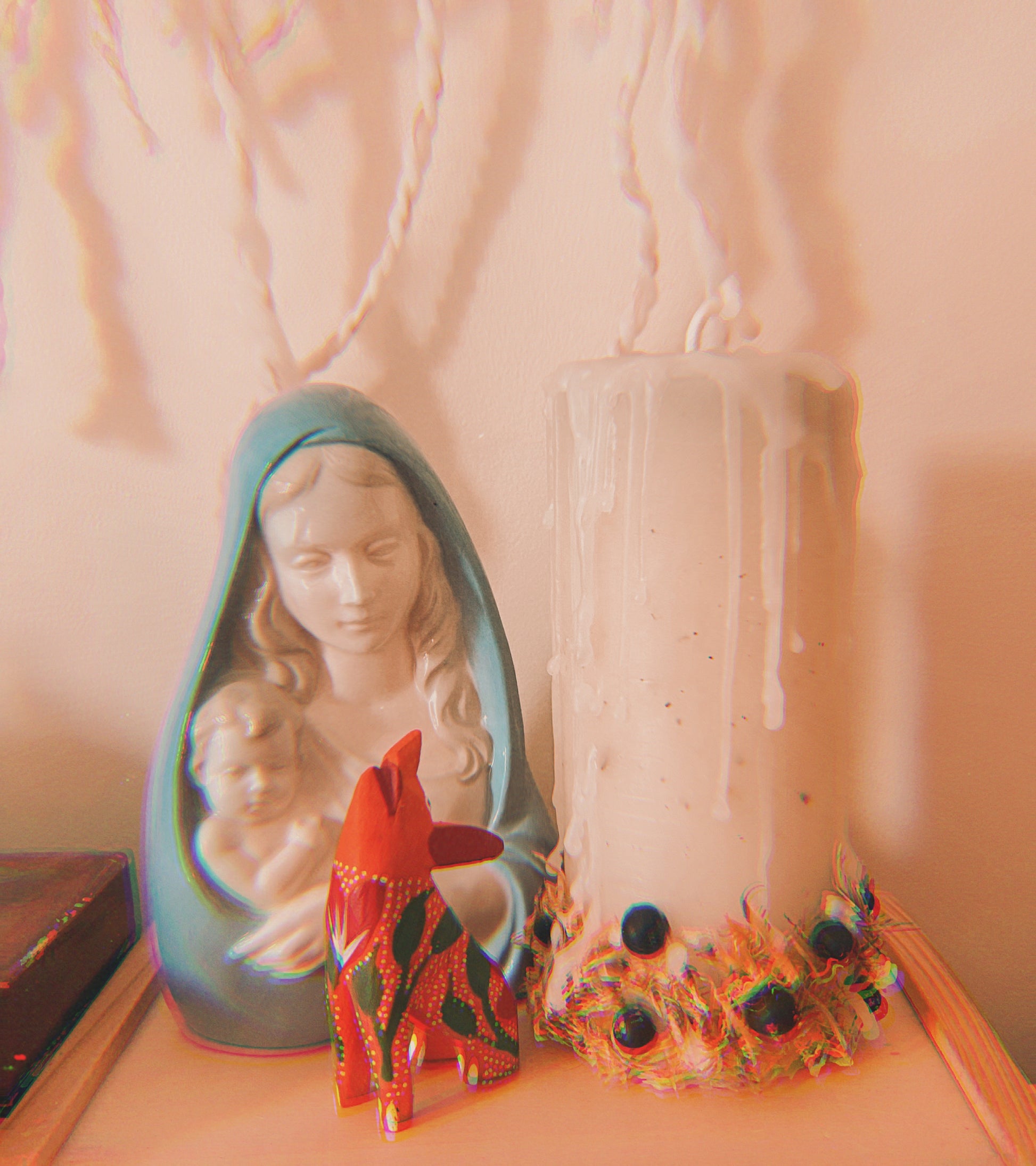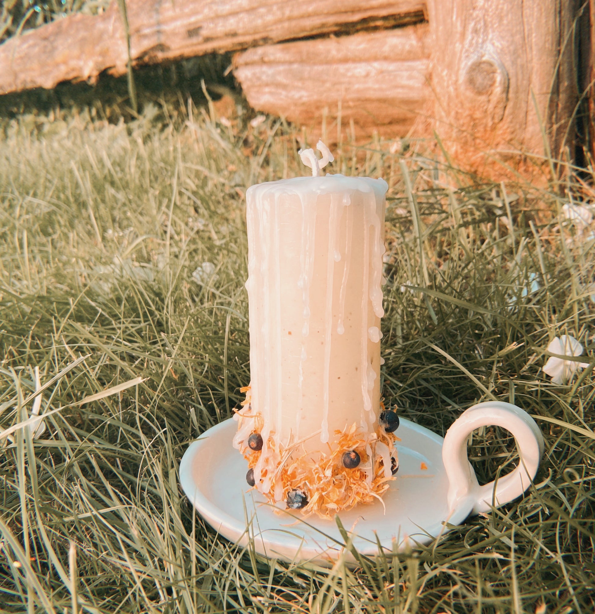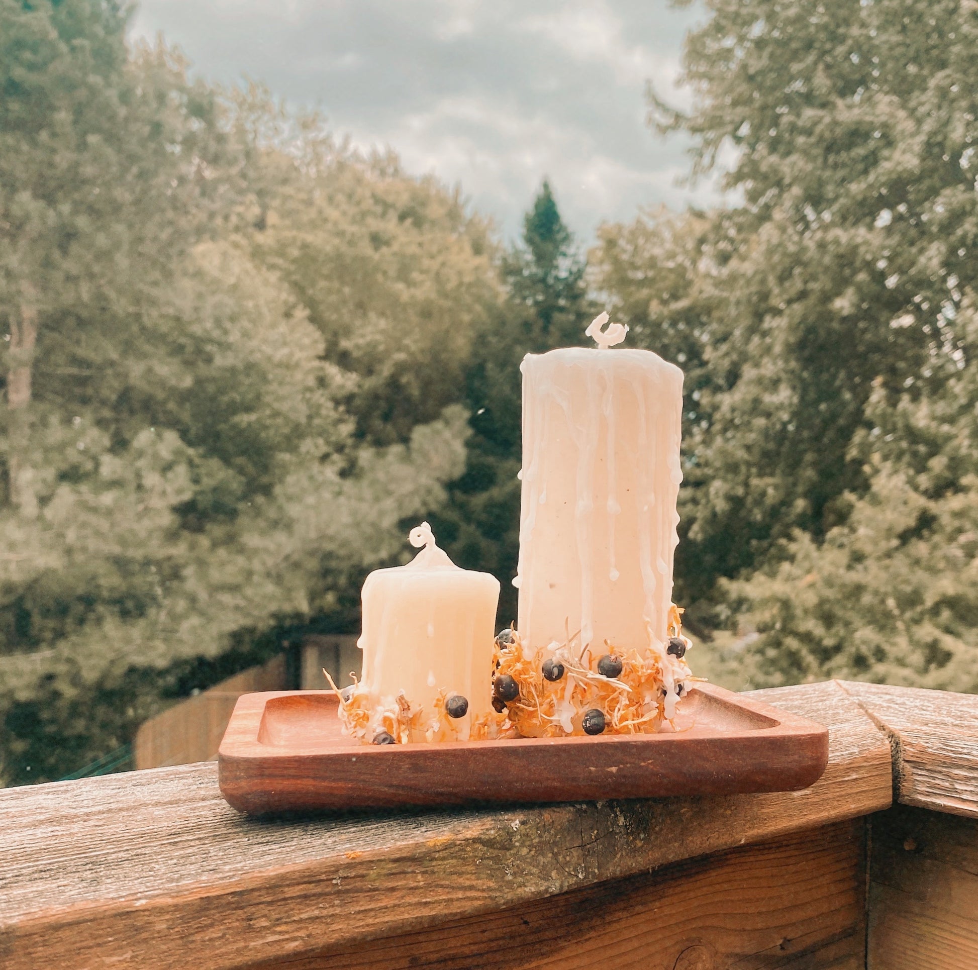 100% pure (white) Canadian beeswax blended with holy basil to carry our prayers, crowned with a pure white wax drip and adorned with calendula (to soothe), juniper berries (to guard the veil) and rosemary (for remembrance)