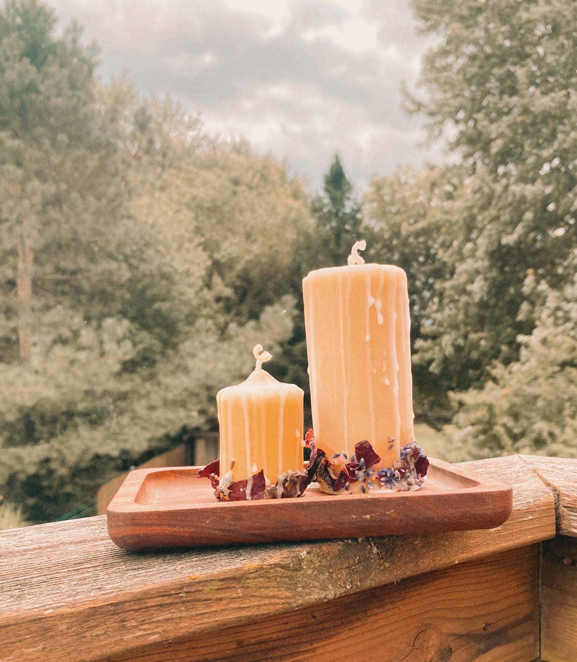 the Mother pillar is 100% pure Canadian beeswax blended with dried organic yarrow (healing), crowned with a white wax drip (to honour the death of the Maiden), adorned with dried rose and lavender (connection, love, calm)